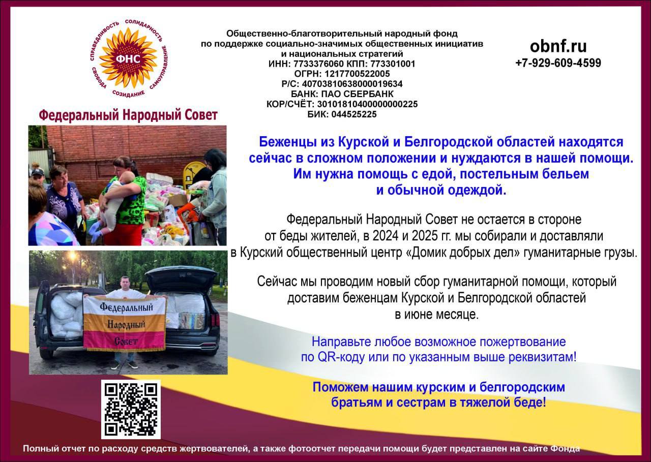 Общественно-благотворительный народный фонд при Федеральном Народном Совете запускает новый сбор гуманитарной помощи для беженцев из Курской и Белгородской областей.