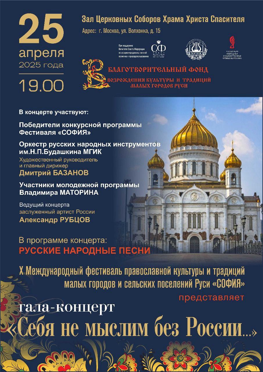 25 апреля 2025 года в Храме Христа Спасителя прошёл гала-концерт в рамках фестиваля духовной культуры "София", объединивший представителей культуры, духовенства, общественных организаций, студенчества и молодёжи со всей страны.